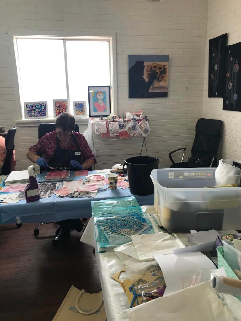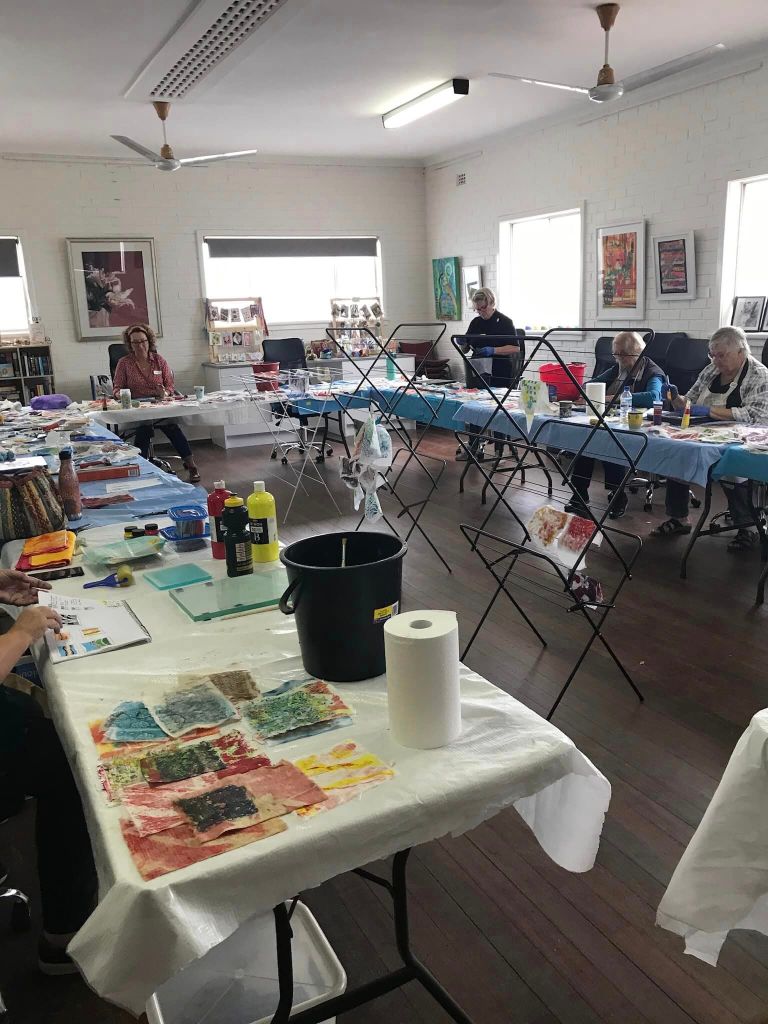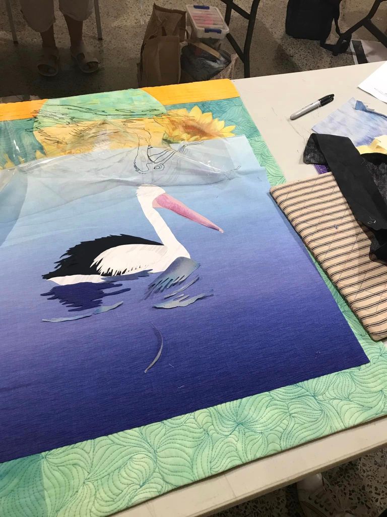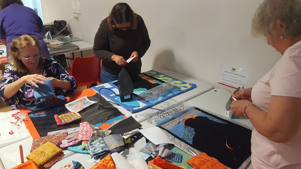 Tutor Phil Thomas travelled up from Perth this weekend, to give a picture quilt workshop to the eager craft girls in Carnarvon. They had limited time for the class due to travel glitches, but everyone was very patient and did an amazing job in the end. Lovely to see the exhibition space in the background too…