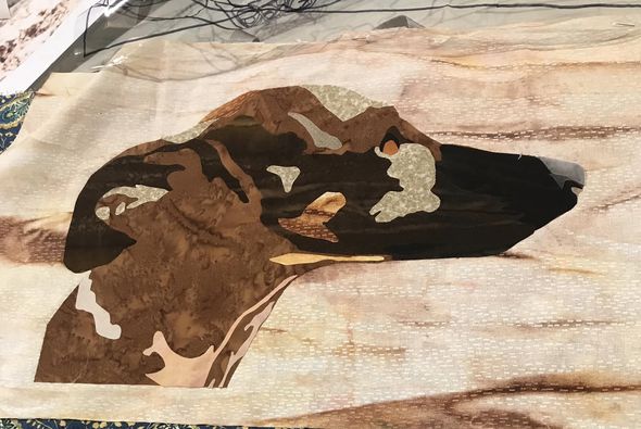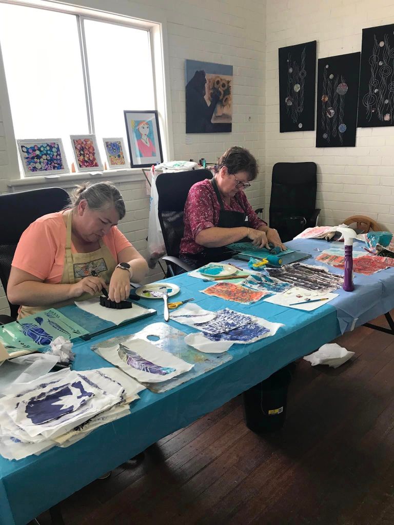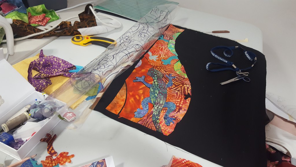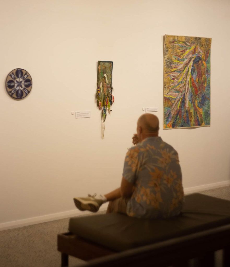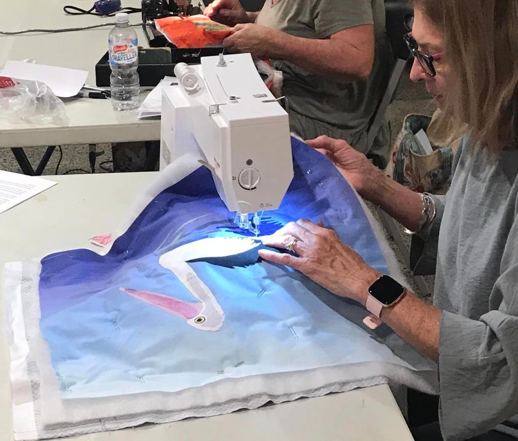 Tutor Phil Thomas travelled up from Perth this weekend, to give a picture quilt workshop to the eager craft girls in Carnarvon. They had limited time for the class due to travel glitches, but everyone was very patient and did an amazing job in the end. Lovely to see the exhibition space in the background too…